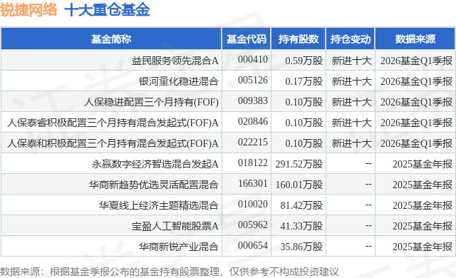 根据2026基金Q1季报公募基金重仓股数据,重仓该股的公募基金共5家,其中持有数量最多的公募基金为益民基金的益民服务领先混合A。益民服务领先混合A目前规模为0.26亿元,最新净值1.7174(4月20日),较上一交易日上涨0.43%,近一年上涨11.68%。该公募基金现任基金经理为关旭 刘芳。关旭在任的基金产品包括:益民红利成长混合,管理时间为2025年4月9日至今,期间收益率为12.3%;益民核心增长混合,管理时间为2025年5月15日至今,期间收益率为21.42%。